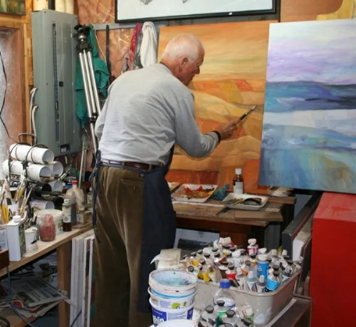 Bob didn't make it to art college until he was 46 years of age; having decided against a formal art education 26 years earlier in favor of an opportunity to write for the local daily newspaper. His journalism career in newspapers and magazines was rewarding for its life-shaping experience of covering politics, sports, business and agriculture. But he always told his family he would one day return to art full time. He graduated from the Nova Scotia College of Art & Design in 1996 with majors in printmaking and painting and began to slowly build his studio style and reputation in Canada. He has earned creative awards from the Canada Council and Nova Scotia Arts Council; had his work selected for many private and public collections in Canada and the U.S., as well as teaching at Acadia University, Ross Creek Centre of the Arts, and numerous workshops across Atlantic Canada. In the 20 years since graduation, Bob's work has been featured in 30 solo exhibitions across Canada, as well as more than 27 group exhibitions in Canada, the U.S., England, Scotland, Japan, and China. Bob has at different times been represented in more than 25 different galleries across Canada, including Wallspace Gallery, St. John's, Nfld.; Lighthouse Gallery, Moncton; St. Michael's Gallery, St. John's, Nfld.; Stimul'eye Gallery, Toronto; River Mill Gallery, New jersey; Stall Gallery, Saskatoon; Arts on Atlantic Gallery, Calgary; Details Gallery, Charlottown, PEI; Teichert Gallery, AGNS, Halifax; Secord Gallery, Halifax; Peer Gallery, Lunenburg; Harvest Gallery, Wolfville; Viewpoint Gallery, Halifax; Wayne Arthur Gallery, Winnipeg; Visual Voice, Truro; Sales & Rental Gallery, Art Gallery of Winnipeg; Gallery 133, Toronto; or Framed Life, Toronto. He has been a founding member of various artist co-ops and cultural development organizations. He has no fixed political compass, but is a passionate critic of globalization, industrialization & greed.